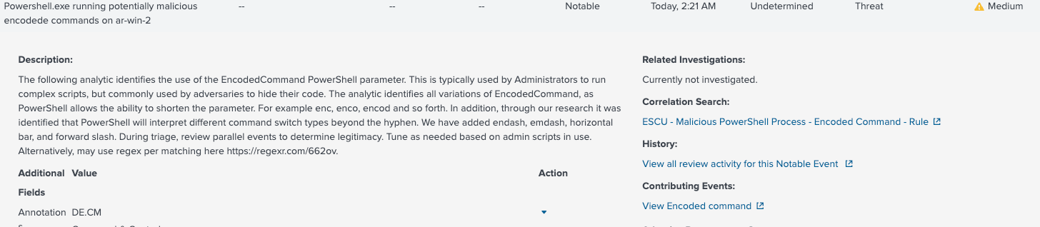 Using an out-of-the-box search designed for Splunk Enterprise Security, we can detect Powershell commands that have been encoded. As the description for this rule states, “[Encoded Powershell] is typically used by Administrators to run complex scripts, but commonly used by adversaries to hide their code.” Find more information about this search at https://research.splunk.com.