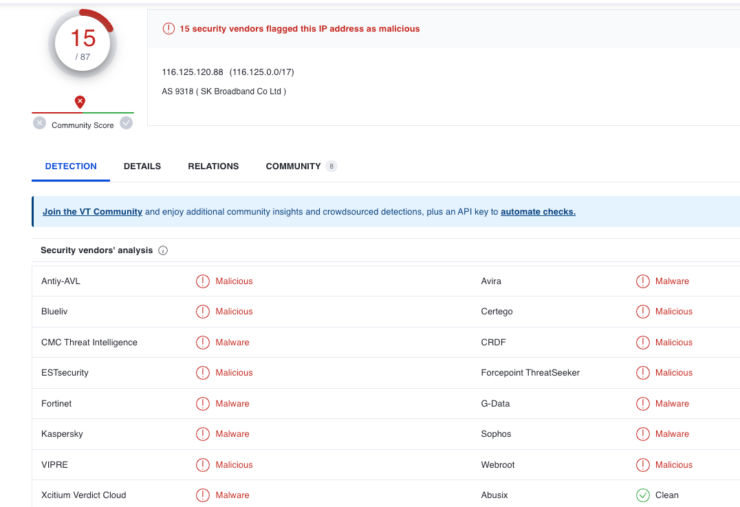 Next, we should check the reputation of this IOC. In this example, I’ll use VirusTotal, but it would be pretty standard to check multiple sources.